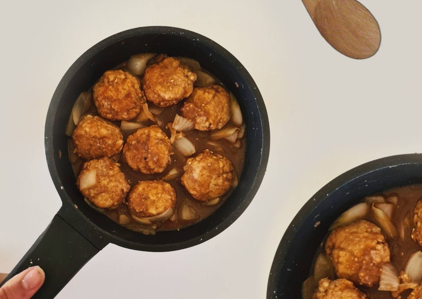 - Una vez marcadas las alb贸ndigas, res茅rvalas y comienza a pochar la cebolla con una cucharadita de aove en la sart茅n. Cuando est茅 ya casi, a帽ade el caldo y las bolas, deja que coja temperatura y a帽ade la harina que te ha sobrado. Me removiendo poquito a poco con una cuchara hasta que espese la salsa a tu gusto 馃