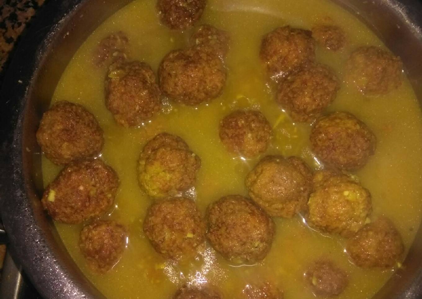 - Mientras se fríen cogemos una olla con aceite de oliva, laurel, cebolla y ajo picadito cuando estén un poco dorado se le echa las albóndigas, un chorreón de vino blanco, un poco de agua hasta que cubra, pastilla de Avecrem, un poco de sal y el azafrán