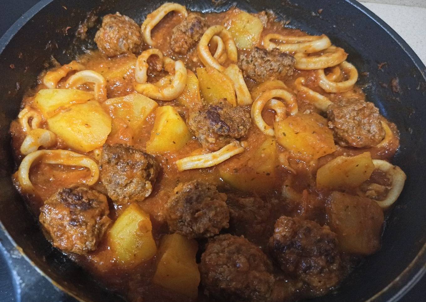 Hey everyone, it is Brad, welcome to my recipe page. Today, we're going to prepare a distinctive dish, Albóndigas con anillas de calamar y patata. One of my favorites. This time, I will make it a little bit tasty. This will be really delicious.
