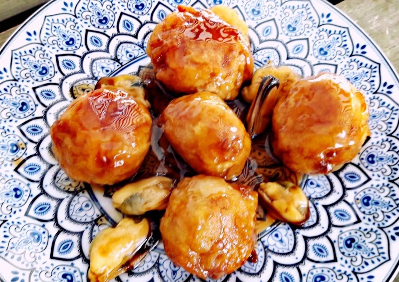 - Mezclamos todos los ingredientes de la salsa ligandolos bien en un recipiente, y los ponemos en la misma sartén donde habíamos frito las albóndigas, reciclando todo el aceite antes de echar la salsa. Cuando la salsa parezca un caramelo incluimos las albóndigas y un puñado de carne de mejillón cocida. Y ya están listas para comer.
