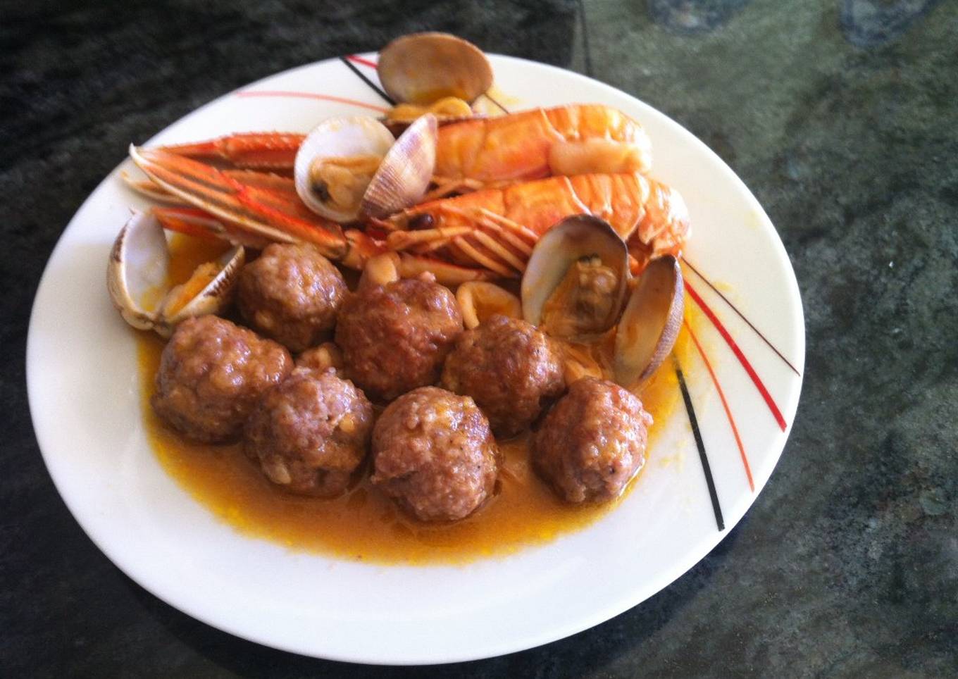 Un rico plato entre mar y montaña, tenia unas cigalas, almejas, patas y aletas de calamar y carne picada y prepare unas exquisitas albóndigas.