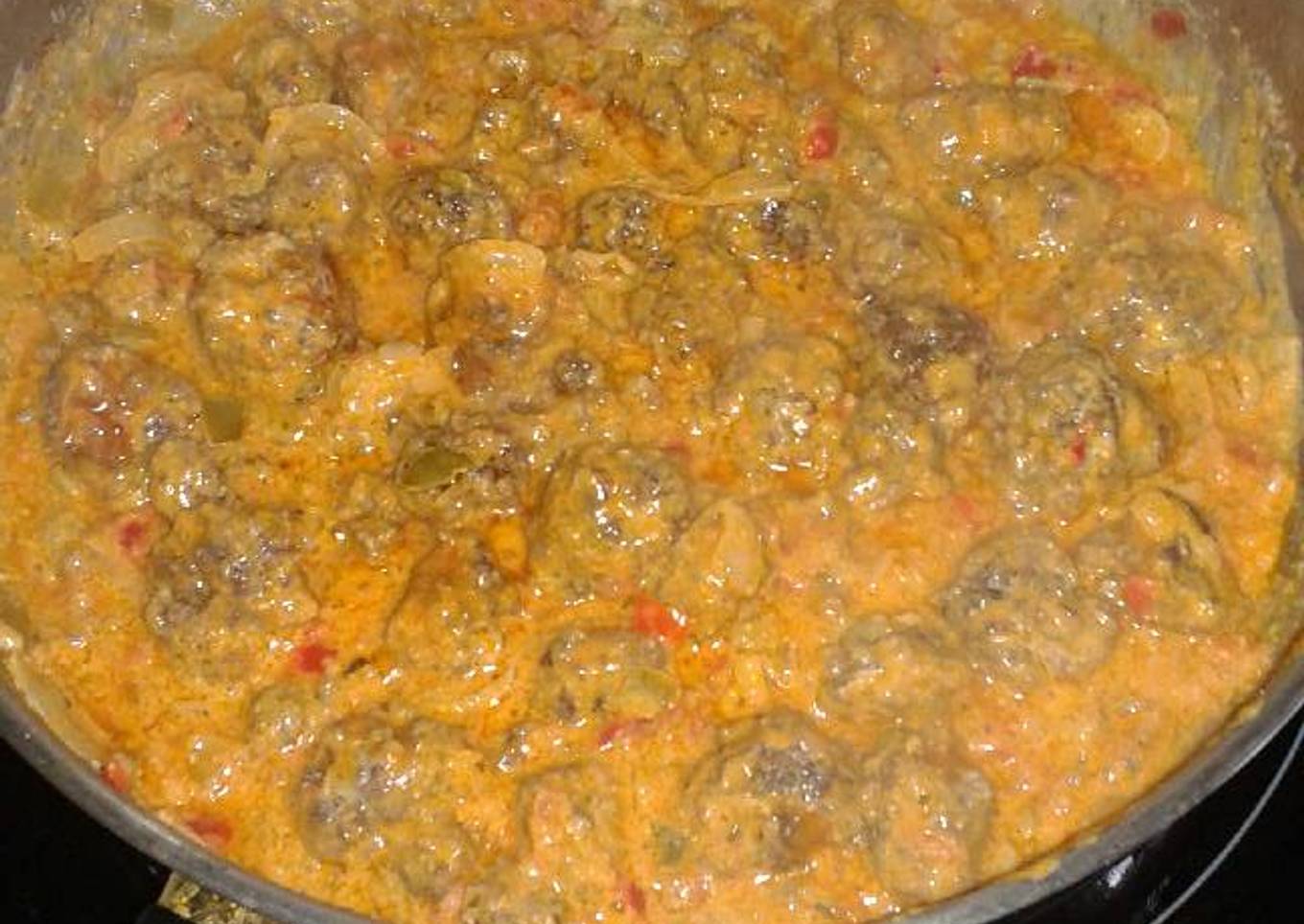 - Hacer bolas con la masa de la carne, freír y añadirlas a la verdura, remover, poner la nata para cocinar al gusto y tomate frito y listo