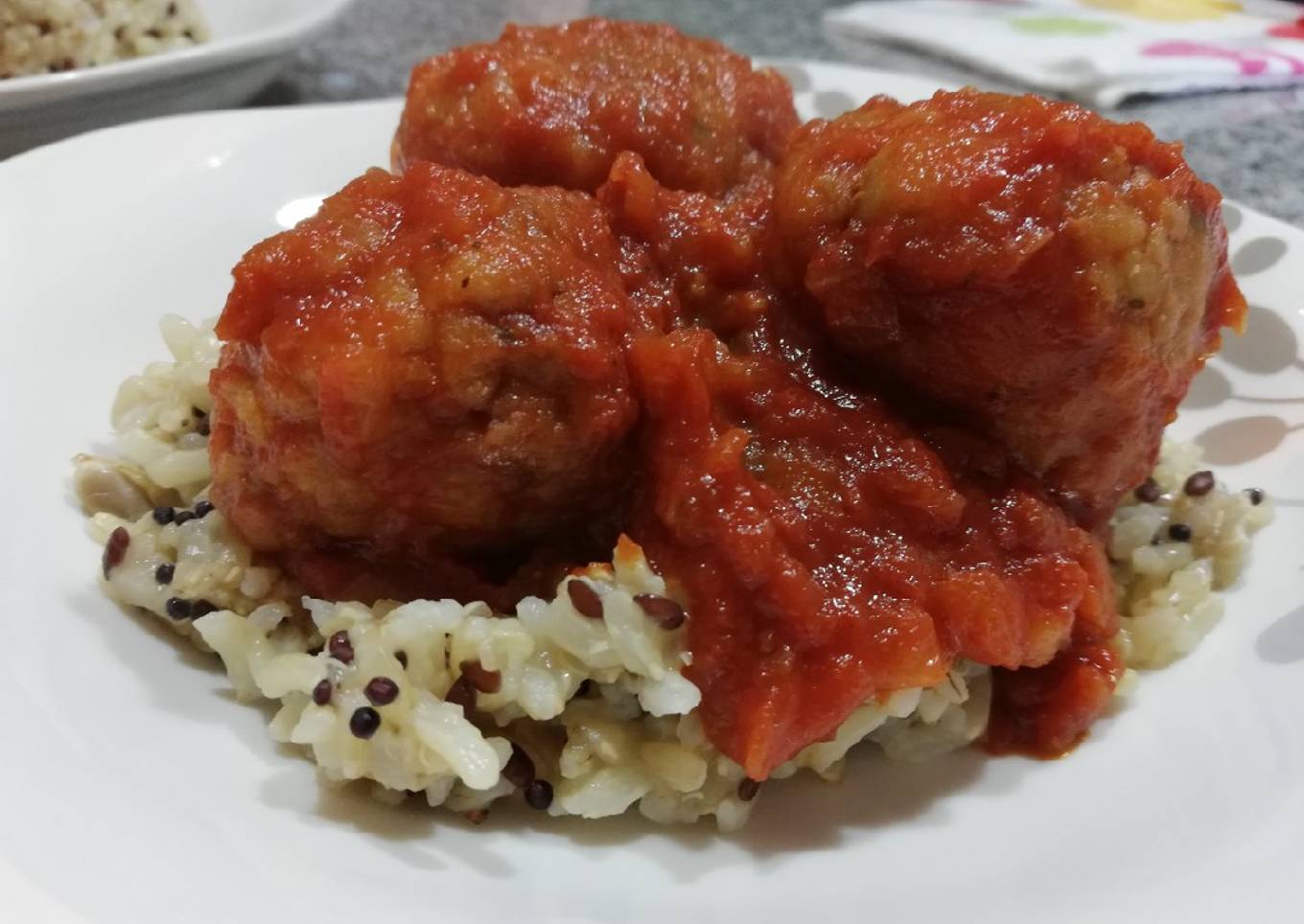 - Cuando el arroz esté listo (le costará unos 20 minutos, por lo que las albóndigas estarán dentro de la salsa unos 10) solo nos queda servir! El arroz blanco, la salsa de tomate y las albóndigas han sido una combinación perfecta!👌