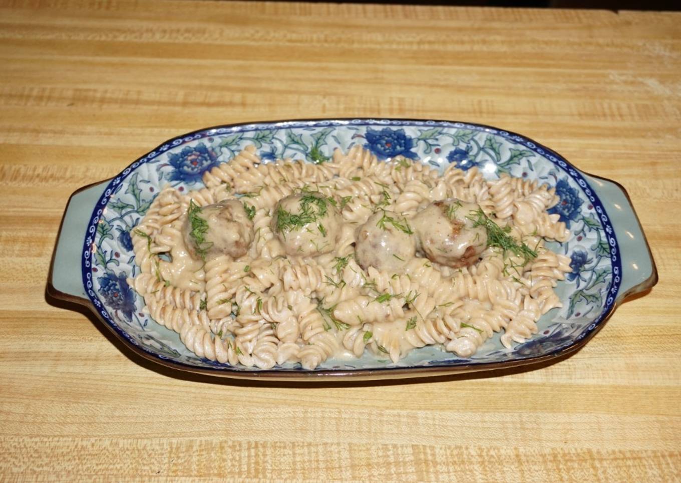 Estas albóndigas Suecas son deliciosas, servidas con una salsa básica velouté terminada con crema y eneldo, servidas sobre una cama de pasta o un puré de camote.
