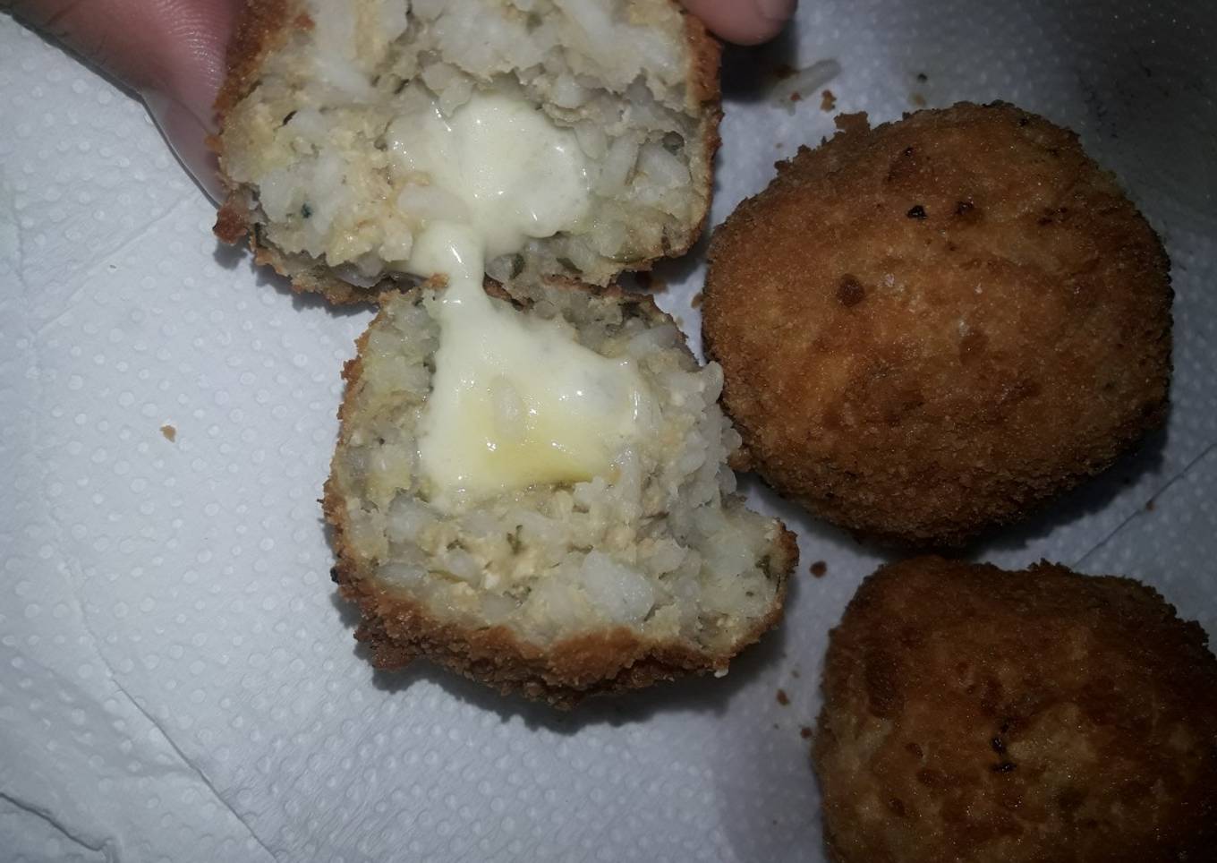 - Al arroz ya frío le agregamos un huevo y la harina hasta ver que se pueda hacer bollitos y no se desarmen. A esos bollitos le vamos a agregar un cubito de muzzarela o de queso cremoso en el centro.